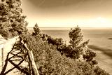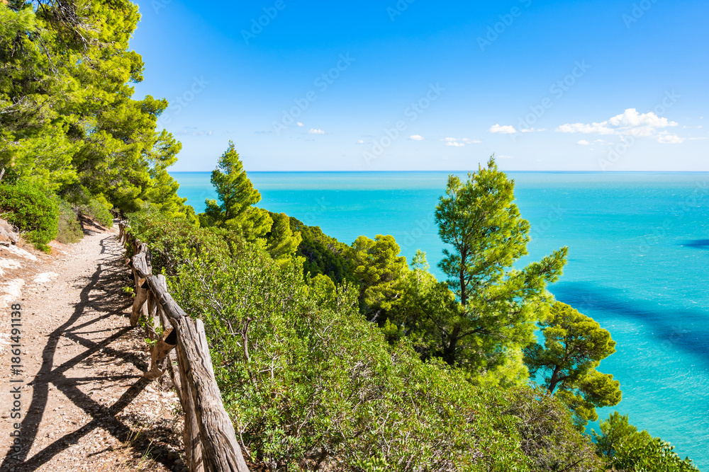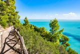 Coastal hiking path with wooden railing overlooking turquoise Adriatic waters near Vignanotica beach, Apulia, Italy
