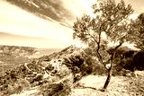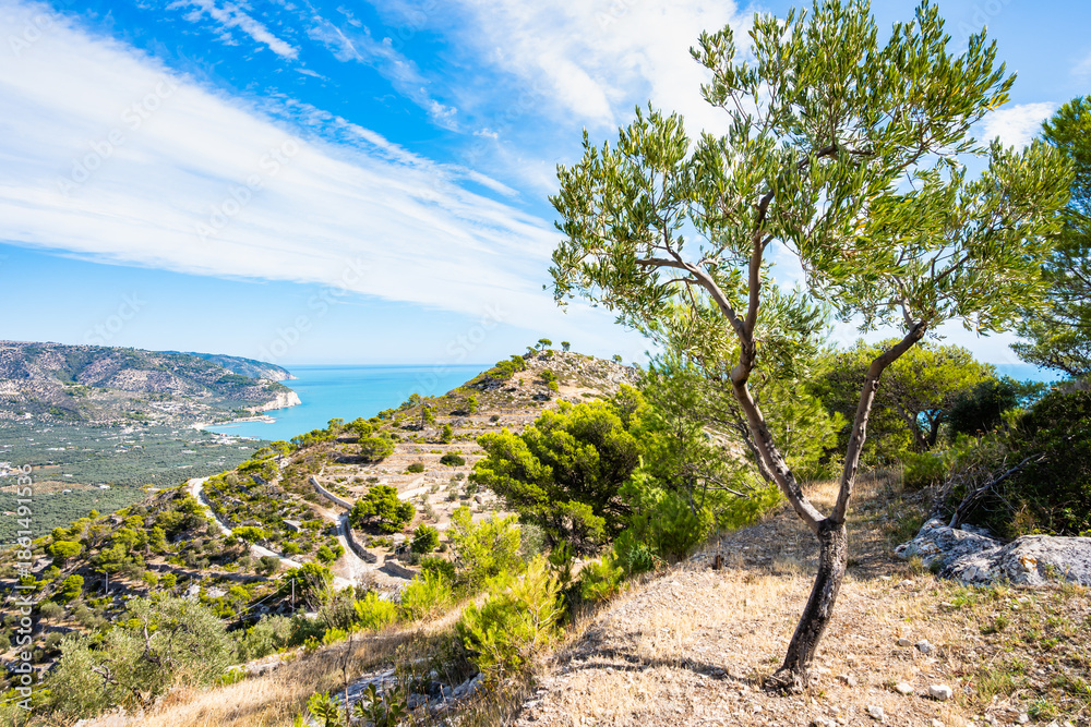 Winding coastal road through olive groves and pine trees overlooking turquoise waters, Apulia, Italy