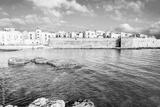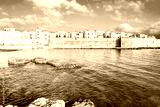 Coastal fortress and old town walls reflected in the turquoise waters of the Adriatic Sea in Monopoli town, Apulia, Italy