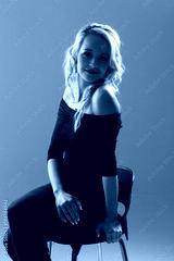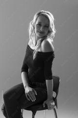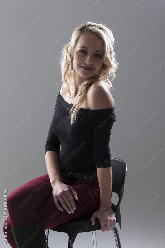 Beautiful blond woman in curly hair and black top and red pants on grey background