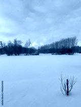 white snowy winter park with trees, buches, iced pond