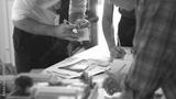 Close up of smart business team hand working together to plan design while looking at project plan from tablet and discussing about blueprint and building construction at meeting table. Alimentation.
