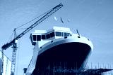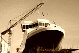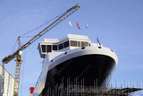 Shipbuilding construction in progress with tower crane blue sky port harbor harbour greenock glasgow Scotland uk