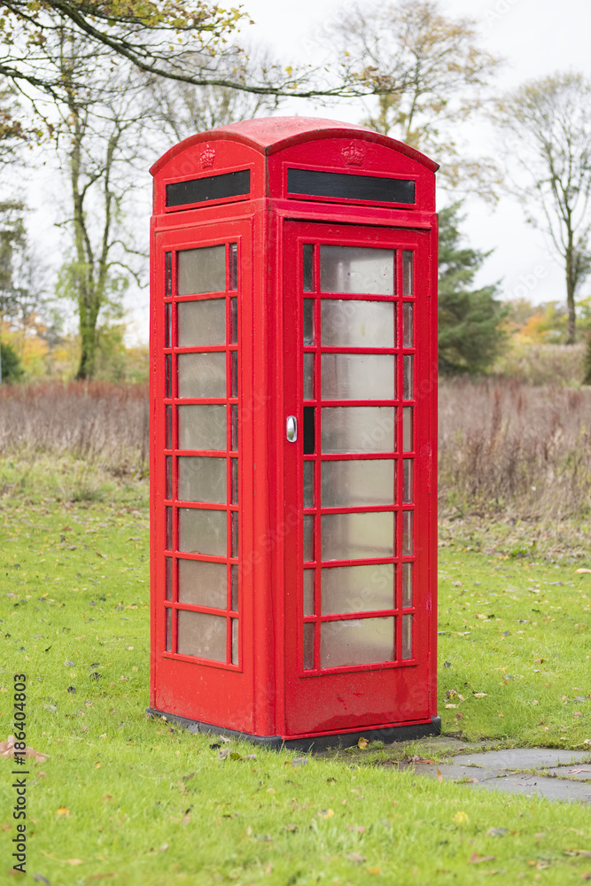 Single lone red old retro telephone box coin operated