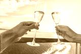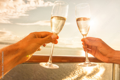 Luxury cruise ship travel couple toasting champagne glasses for celebration honeymoon. Caribbean holiday drinking doing cheers at sunset view sun flare of cruise holiday destination.