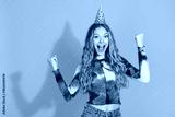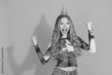 Young woman celebrates birthday with party hat and tie dye top against yellow background