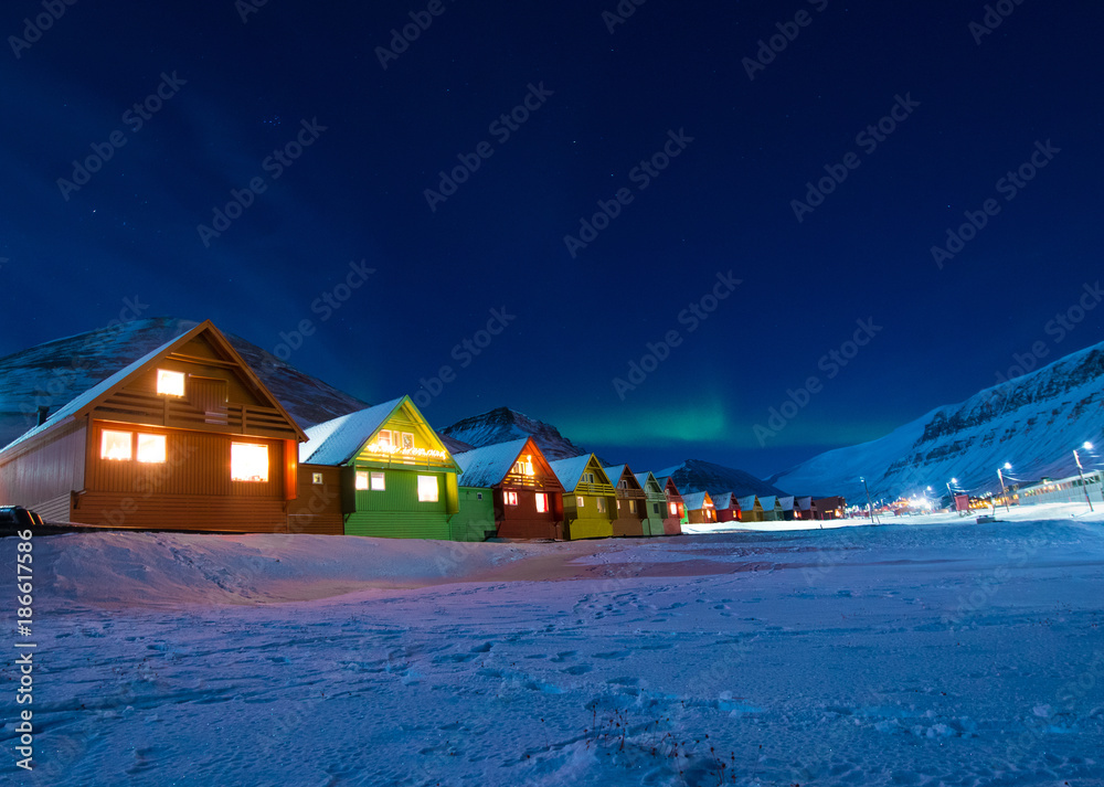 The polar arctic Northern lights aurora borealis sky star in Norway Svalbard in Longyearbyen the moon mountains