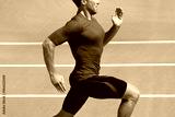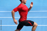 Athlete runner running on athletic track training cardio. Jogger man jogging fast pace for competition race on blue outdoor stadium tracks wearing red compression sport clothes. Male person fit body.