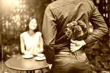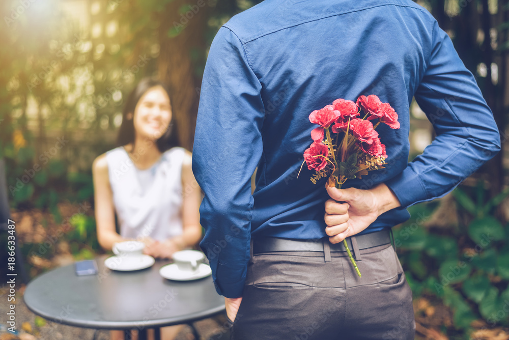 The man is hiding red flowers behind him in order to surprise his girlfriend.