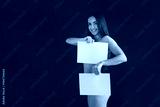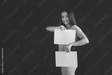 young girl holding an empty banner. Young woman with long black hair stands isolated on black background. The girl has a sports figure, she is dressed in white underwear. Beautiful panties and bra.