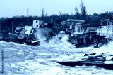 Coastal erosion - houses built on weak clay soil slide down to the sea and collapse