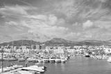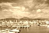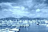 Benalmadena Puerto Marina sport port, a view to piers with white modern luxury sport yachts, Mediterranean sea and mountains and cloudy sky at the background. Spain winter relax vacation concept.