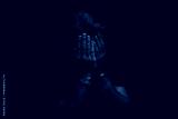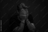 Handcuffed man hiding his face. Captured criminal. Black and white toning