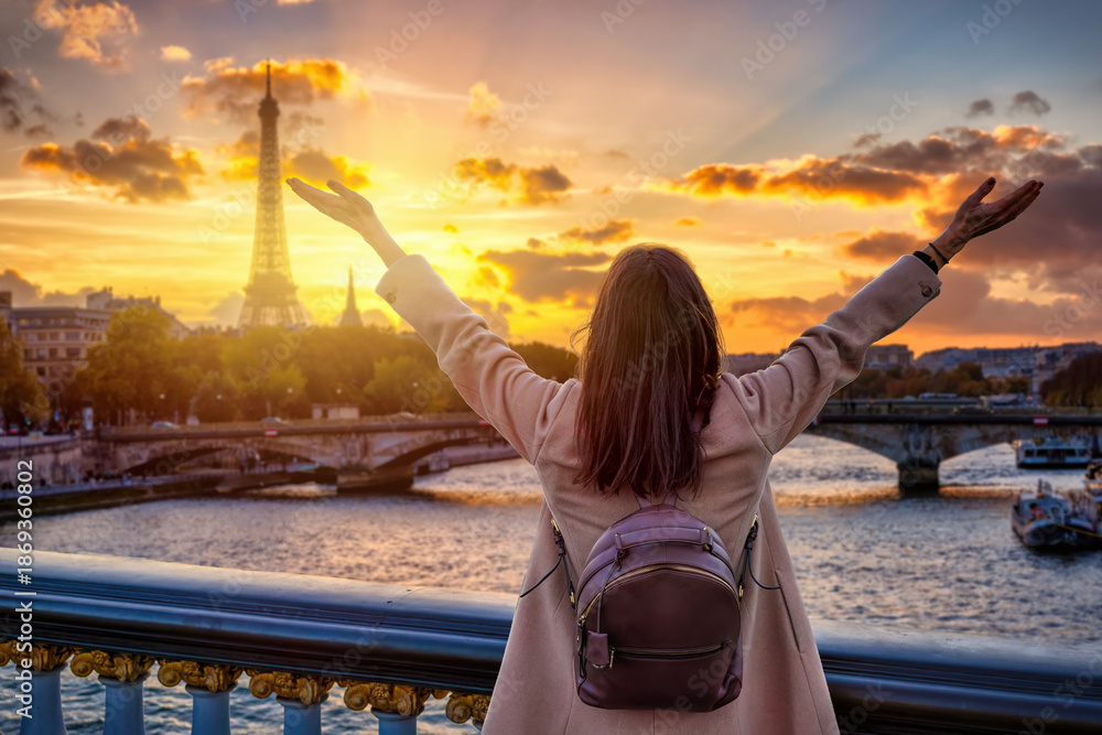 A happy tourist woman looks at the beautiful sunset behind the skyline of Paris, France, with Eiffel Tower and River Seine