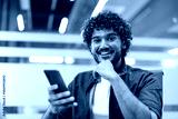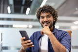 Close-up portrait of a young Indian man sitting in a chair at a desk in an office, holding a phone and smiling at the camera