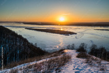 Panoramic view on frozen Volga river in winter during sunset from hill near Samara city