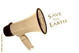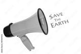 Save the earth slogan with megaphone loudspeaker on white background. Green issues concept, environmental conservation, protect the planet.