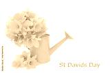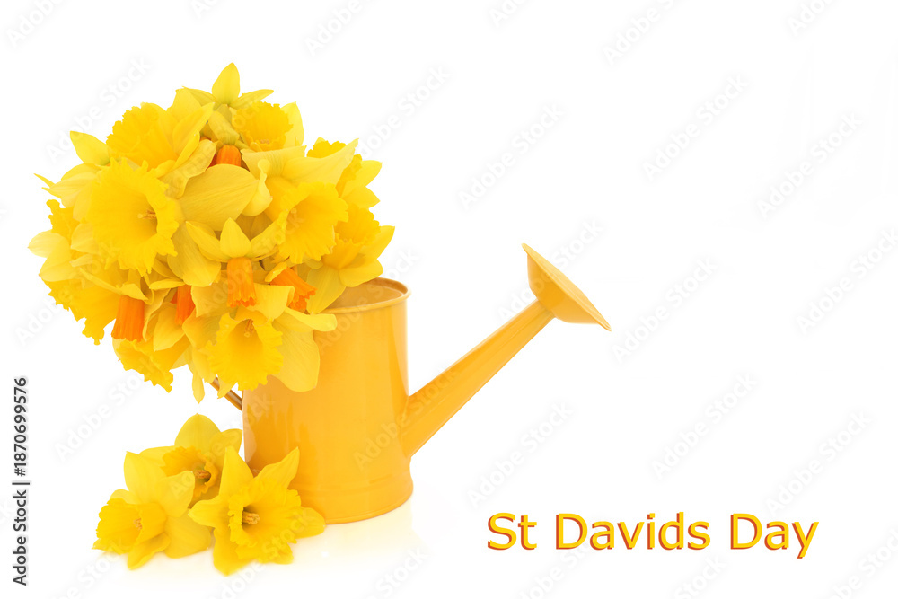 Spring daffodil, narcissus flowers in yellow watering can on white background. Traditional Welsh St Davids Day national symbol floral bouquet arrangement.