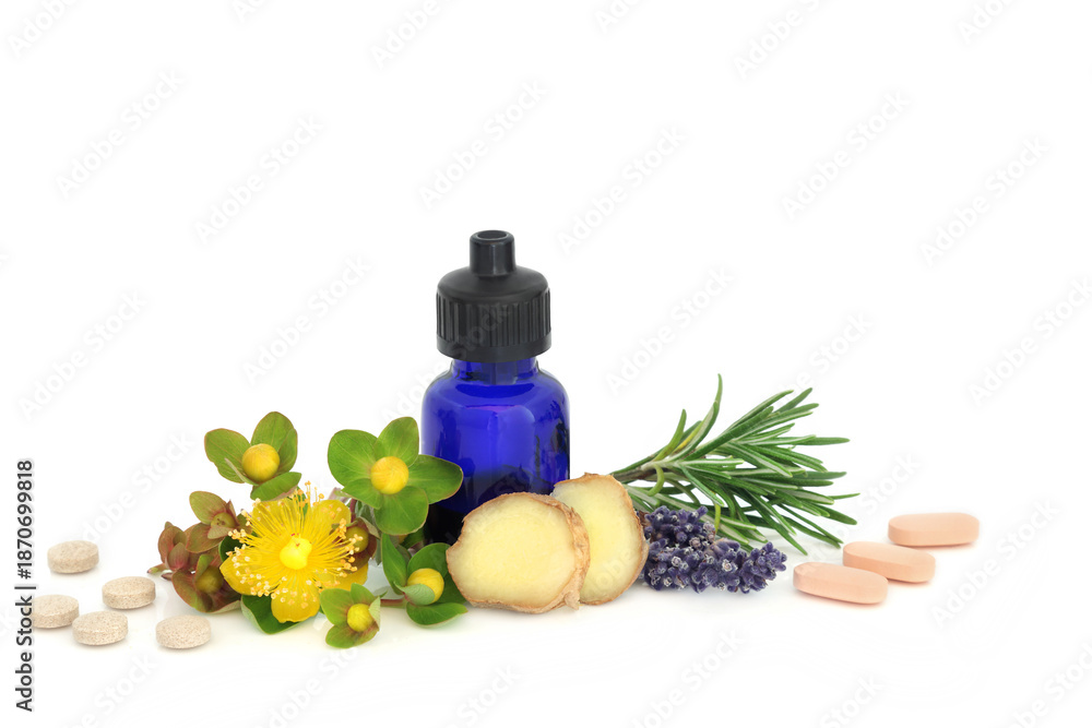 Herbal medicine and nutritional supplements used to treat depression with herbs, tablets, blue tincture bottle on white. Natural healing for depressed states of mind.