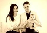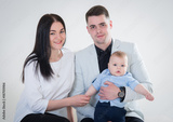 Young happy family with baby boy shooting in the photo studio, smiling, posing on white background