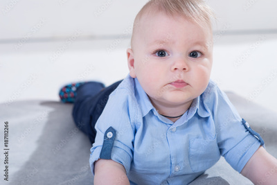 Cute little baby boy in blue shirt and jeans lying on the blanked and posing in the photo studio on white background