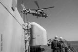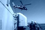 a helicopter provides the defense of a military warship. boarding of a vessel. sailors watch a helicopter dip over a ship. military drill and rescue operation.