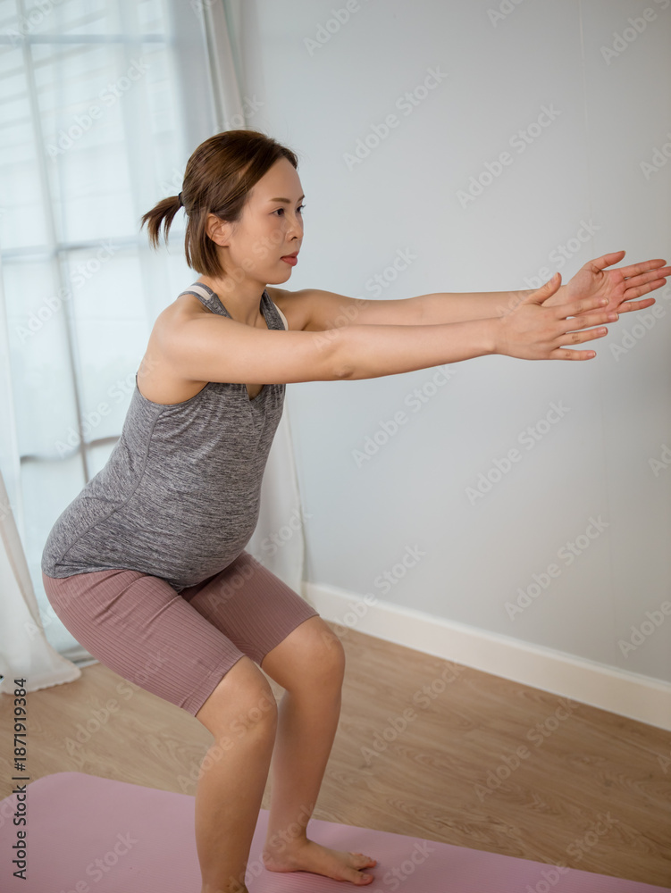 Asian pregnant woman in sportswear doing exercise in living room at home.