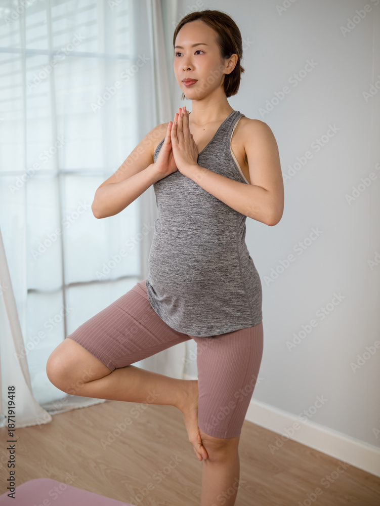 Asian pregnant woman in sportswear doing exercise in living room at home.