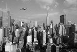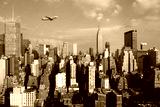 View of midtown of Manhattan on sunset. Plane flies over skyscrapers of New York City, Manhattan