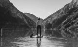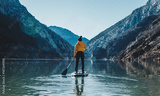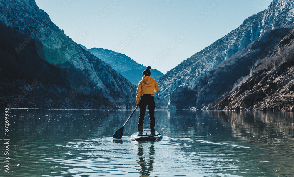 a woman with yellow plumber paddle surfing on a lake in a snowy mountain landscape