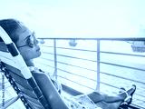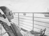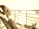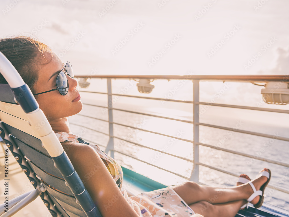 Cruise ship vacation travel woman relaxing sun tanning lying down on lounger chair on deck balcony. Suntan girl carefree with sunglasses
