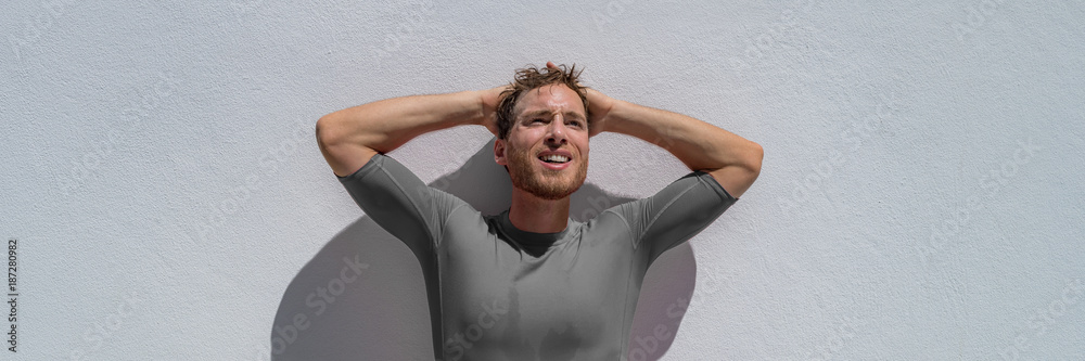 Tired sport man exhausted breathing with difficulty after fitness training resting with arms on head. Headache, dehydration concept. Athlete sweating in summer, sun or heat stroke banner panorama.