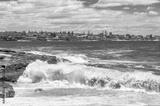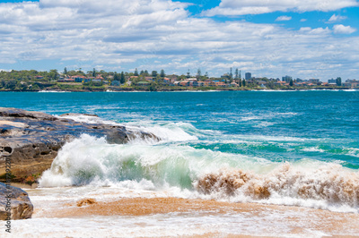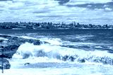Beach view white waves and suburb in the distance