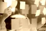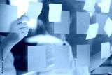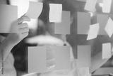Business meeting Hands using sticky note on windows wall with post it on memory.