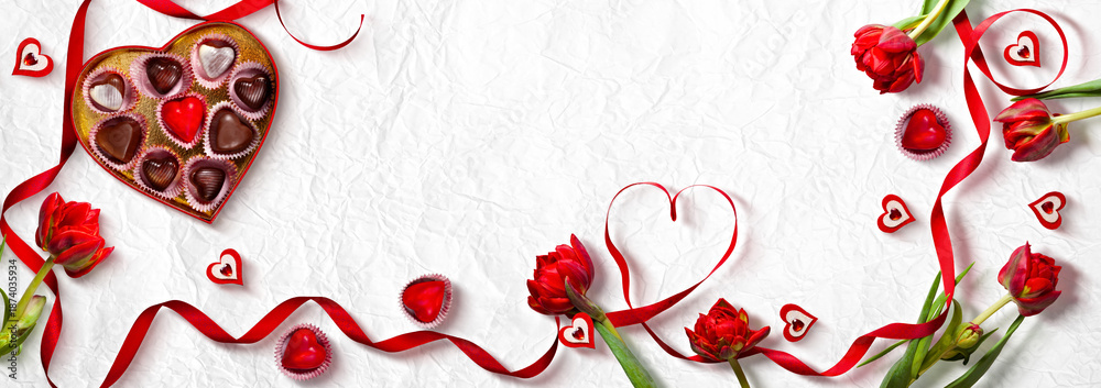 Valentine's Day Celebration with Tulips, Heart Chocolates, and Red Ribbons on White Background, banner