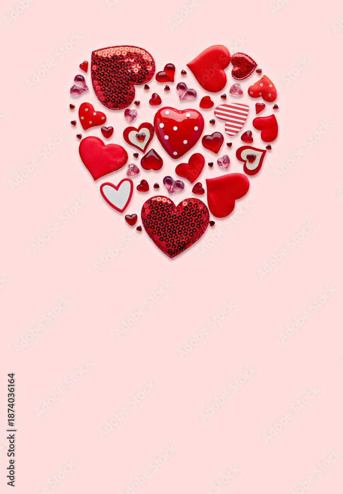 Heart-Shaped Arrangement of Red Decorations on Pink Background for Valentine's Day