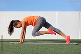 Fitness girl doing abs exercise to tone stomach muscles. Tiger curl reverse crunch planking bodyweight floor workout. Asian fit woman training outdoors on exercise mat. Gym lifestyle.