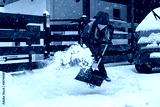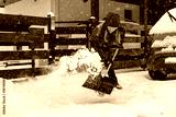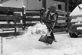 Young woman with a snow shovel clears snow from the sidewalk in front of her house