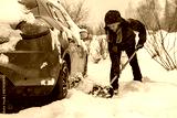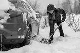 Woman with a snow shovel clears snow from a snow-covered car so she can drive out of the parking lot in front of her house