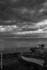 landscape with a fishing boat on the waterfront with a dramatic sky. background in HDR, dramatic clouds and blue white boat.