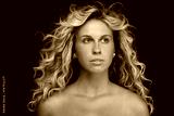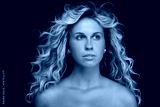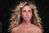 Beauty portrait of the blonde woman with curly hair on the black background.