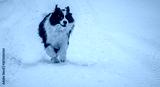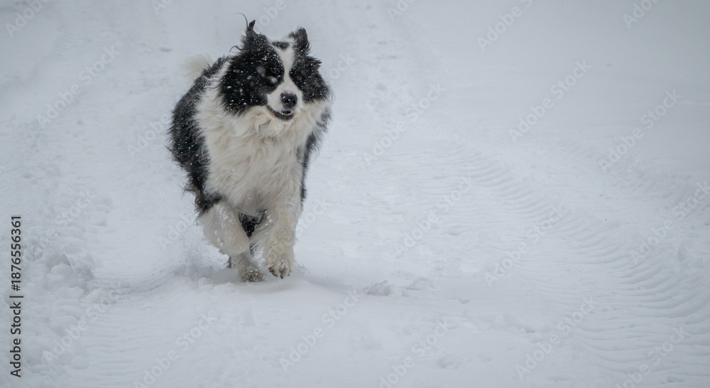 Happy Border Collie running in the snow, copy space