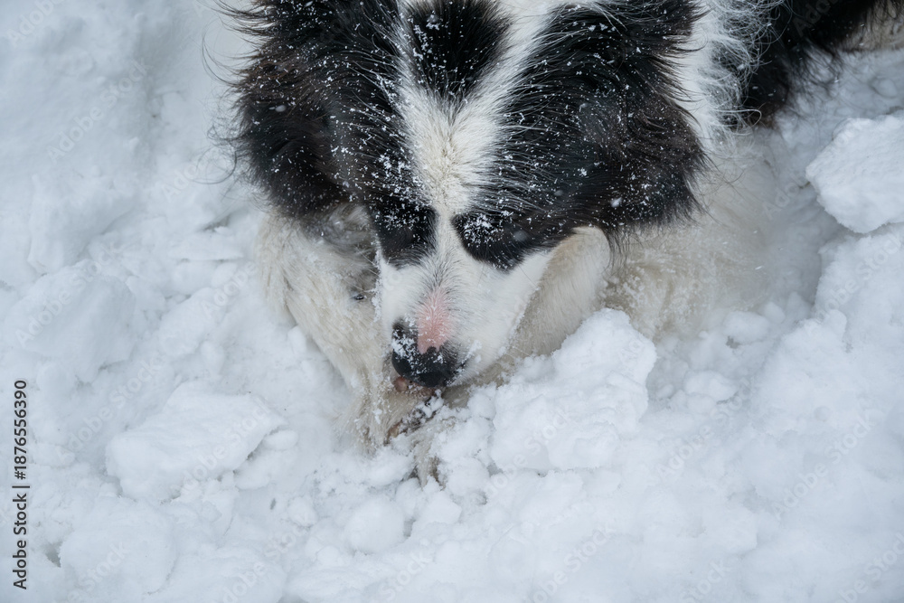Dog bites ice off its paws during a winter walk, winter problems for dogs
