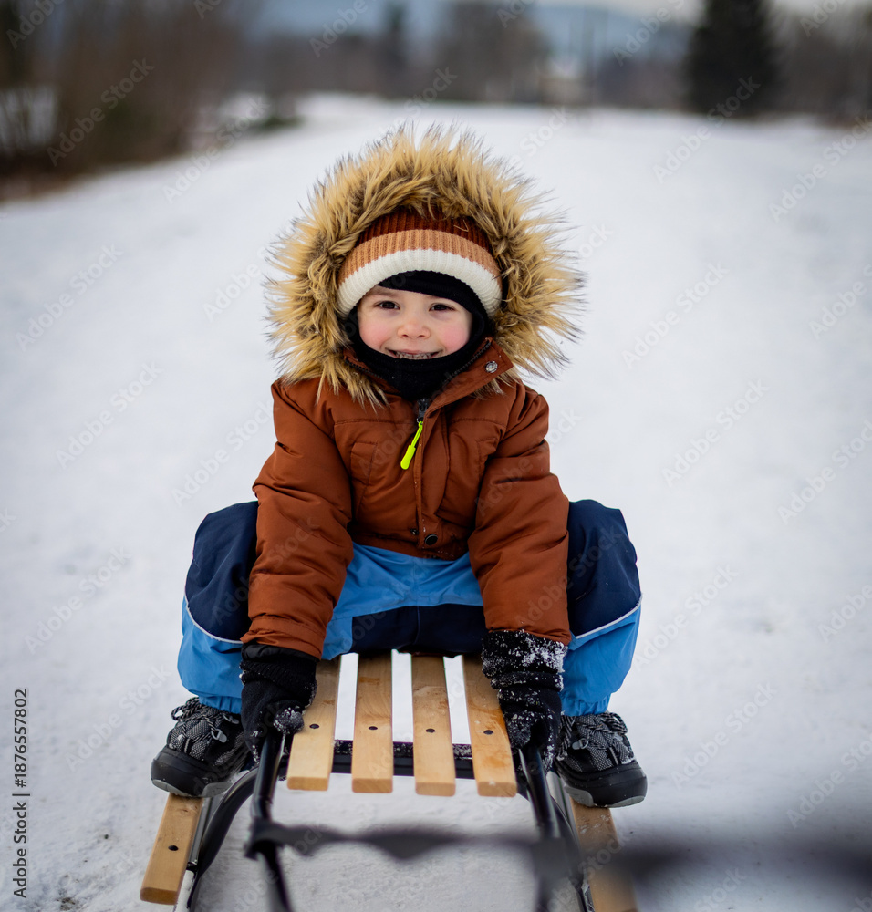 Cheerful child rides a sled during a winter walk