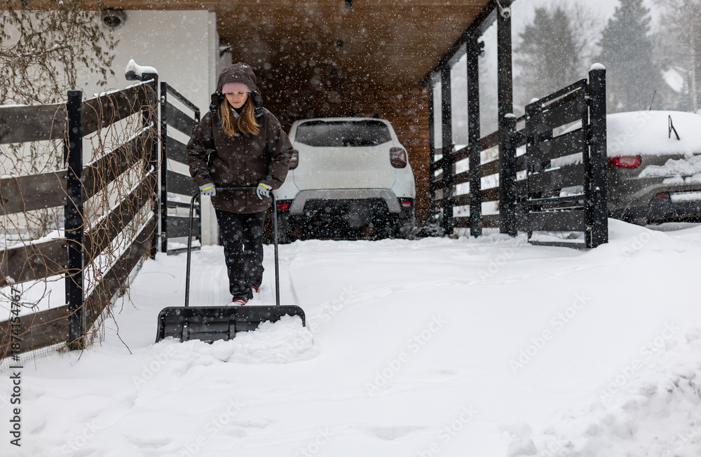 Happy child rides a sled along a snow-covered path during a frosty winter