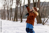 Delighted child throws snow into the air, a winter portrait in the snow dust