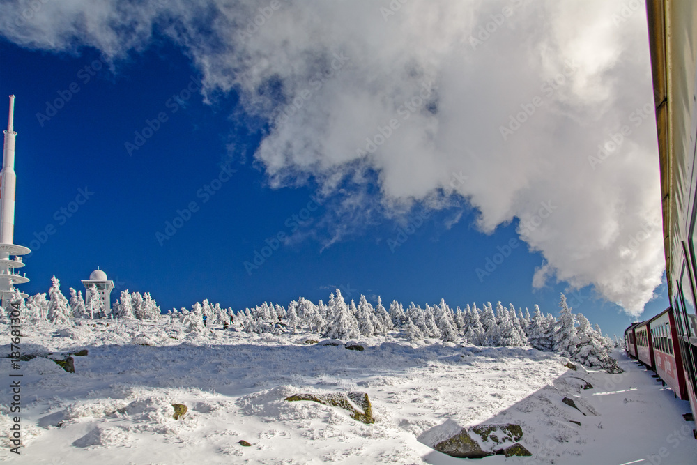 steam locomotive in winter on Mt. Brocken, Germany, Brockenbahn im Winter