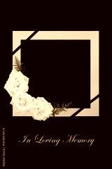 In loving memory white rose flowers on black background with gold frame and symbolic ribbon. Design for floral memorial tribute card with text.
