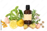 Herbal medicine for summer sneezing hay fever allergies, antihistamine treatment with pharmaceutical pill and capsule drugs, brown tincture bottle on white.