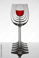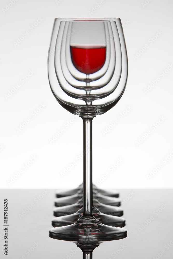 Row of empty wine glassesand one filled at the rear standing on reflective surface